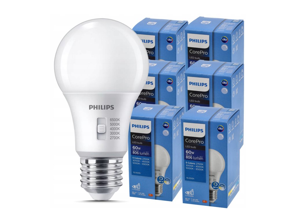 Žárovka Philips CorePro LEDbulb 5CCT nabízí skvělou flexibilitu díky...možnost volby teploty barev v jedné lampě.Vestavěný přepínač vám umožňuje určit ideální světlo pro váš interiér – od teplého a relaxačního až po jasné, neutrální nebo studené, vhodné pro práci a soustředění.