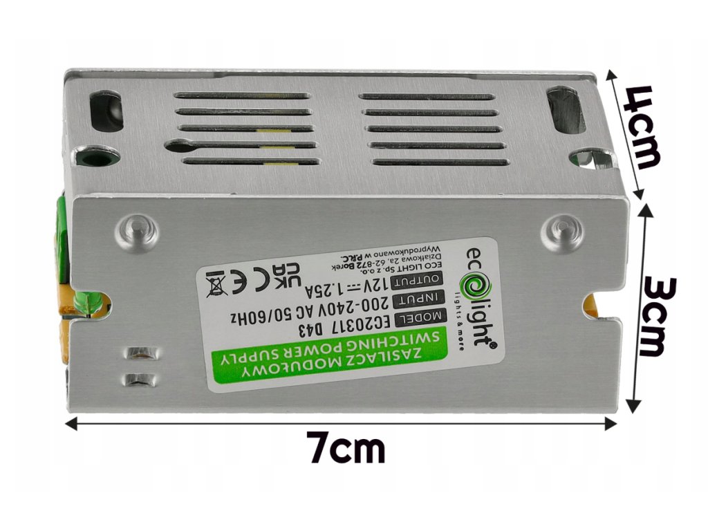 Technické údaje:TypModulární tenký Moc15 W Vstupní napětí220–240 V střídavého proudu Výstupní napětí12V stejnosměrného proudu Stupeň těsnostiIP20 Rozměry (mm)70 × 39 × 31 |