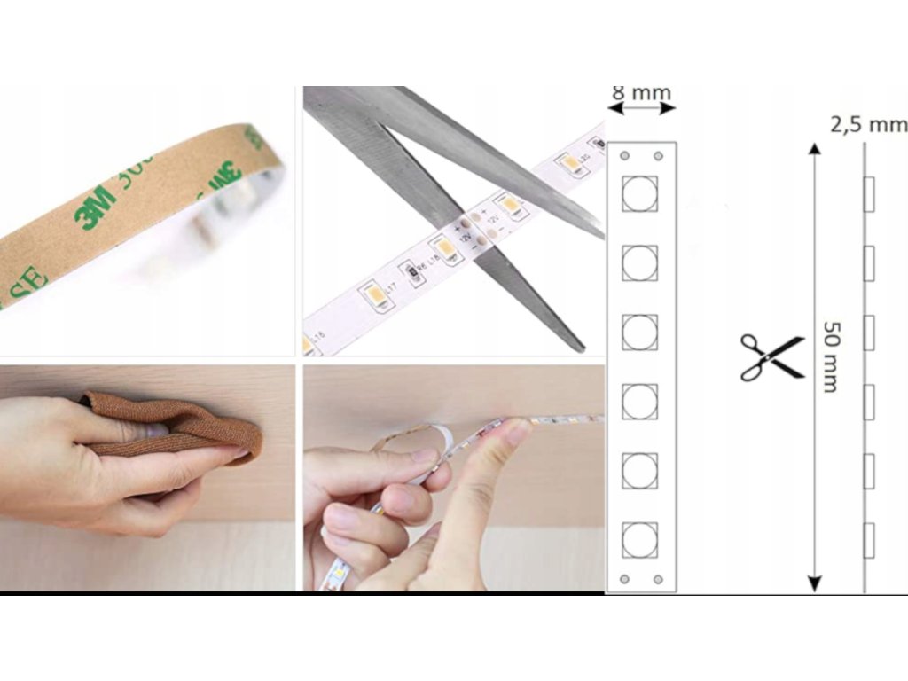 - LED pásky mají vlastní samolepicí vrstvu, která usnadňuje instalaci, nicméně doporučujeme dodatečně zpevnit spojení mezi páskem a podkladem dalším rychleschnoucím lepidlem, silikonem nebo jiným pojivem.