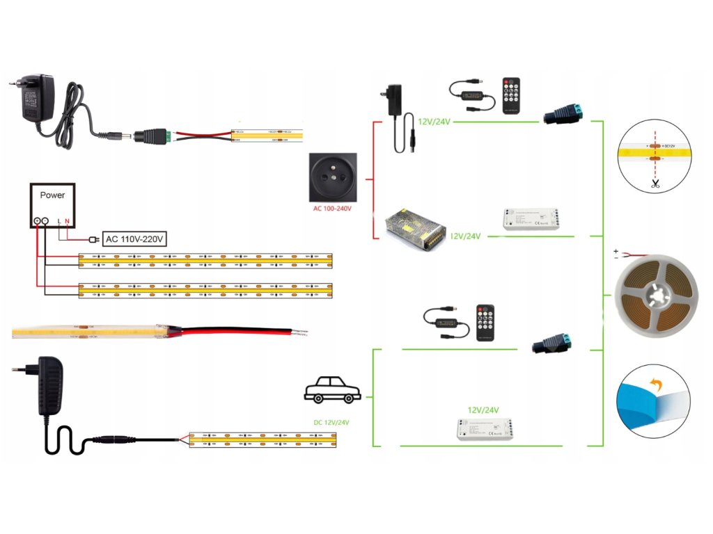 - Při instalaci pásku použijte dodatečný zdroj napájení nebo uzavírejte obvod k napájení každých 7-8 metrů kvůli poklesu napětí, což je u tohoto typu osvětlovacích výrobků normální jev. Pájení pásku cínem z výroby není výrobní vadou.