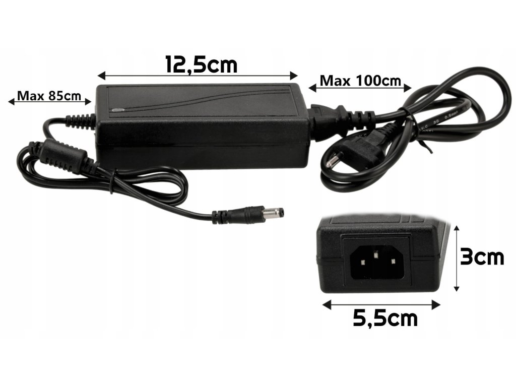 Model: 3A 36W 12V zásuvný zdroj Materiál: PVC pouzdro Vstupní napětí: 230V Výstupní napětí: 12V DC Výstupní výkon: 36W Ochrana proti přetížení: ano Přepěťová ochrana: ano Ventilátor: ne Včetně napájecího kabelu: ano Velikost DC zásuvky: 5,5 x 2 .1mm Certifikáty: CE, RoHS
