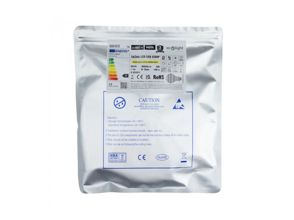 ✔️ Technické údajeTypDigitální COB LED pásek Typ diody:COB Počet diod:360 LED diod/m Barva světla:teplá bílá Teplota barvy: 3000 tisíc Světelný tok:1170 lm/m Moc: 13 W/m² Účinnostcca 90 lm/W Napájecí napětí24 V stejnosměrného proudu Úhel paprsku:120° Stupeň těsnosti:IP20 Délka role: 5 metrů Celkový stream (roll)cca 5850 lm Šířka:10 mm Řezná schopnost:každých 8,3 cm Energetická třída:F |