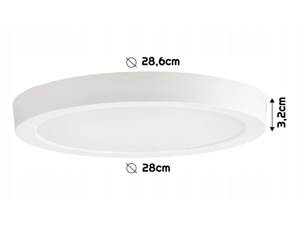 ✅ Dane techniczneRodzaj: natynkowy (downlight) Moc: 24W Strumień świetlny: 2640 lm Barwa światła: biała neutralna Temperatura barwowa: 4000K Napięcie wejściowe: 220–240V AC Stopień szczelności: IP20 Klasa energetyczna: F Współczynnik oddawania barw (CRI): ≥80 Współczynnik mocy (PF): >0.5 Materiał: tworzywo sztuczne Klosz: mleczny Kolor obudowy: biały Kształt: okrągły Wymiary: 295 × 31 mm |