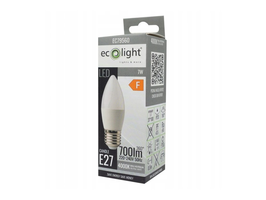 LED žárovka E27 7W C37 4000K 700lm svíčková denní světlo neutrální barva 230V značka Ecolight