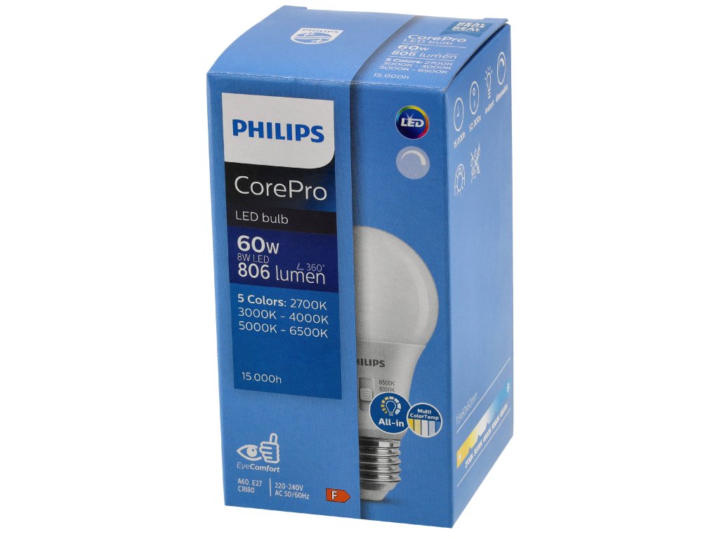 ✨ Cenový hit ✨Philips CorePro LEDbulb 8W E27 5CCT je moderní, energeticky úsporná žárovka s nastavitelnou teplotou chromatičnosti a funkcí stmívání, která nahrazuje tradiční 60W. ✔️ Hlavní vlastnosti produktu✅ 5CCT – pět barevných teplot (2700K–6500K)
