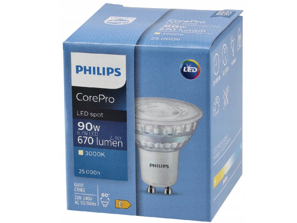 Profesionální LED žárovka PHILIPS CorePro LEDspot GU10 6,7 W je vysoce účinný, teple bílý (3000 K) světelný zdroj, který je perfektní náhradou za tradiční 100W halogenovou žárovku. Díky širokému vyzařovacímu úhlu 60° je ideální pro celkové i akcentové osvětlení a zároveň nabízí úsporu energie a životnost až 25 000 hodin.