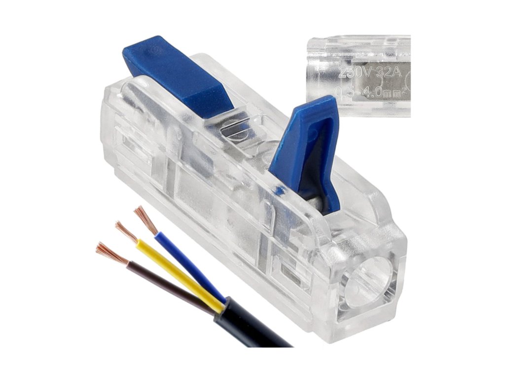 ✅ Oboustranný, průchozí konektory určené pro připojení vodičů z0,5 až 4 mma pro provoz s jmenovitým proudem 250 V/32 A