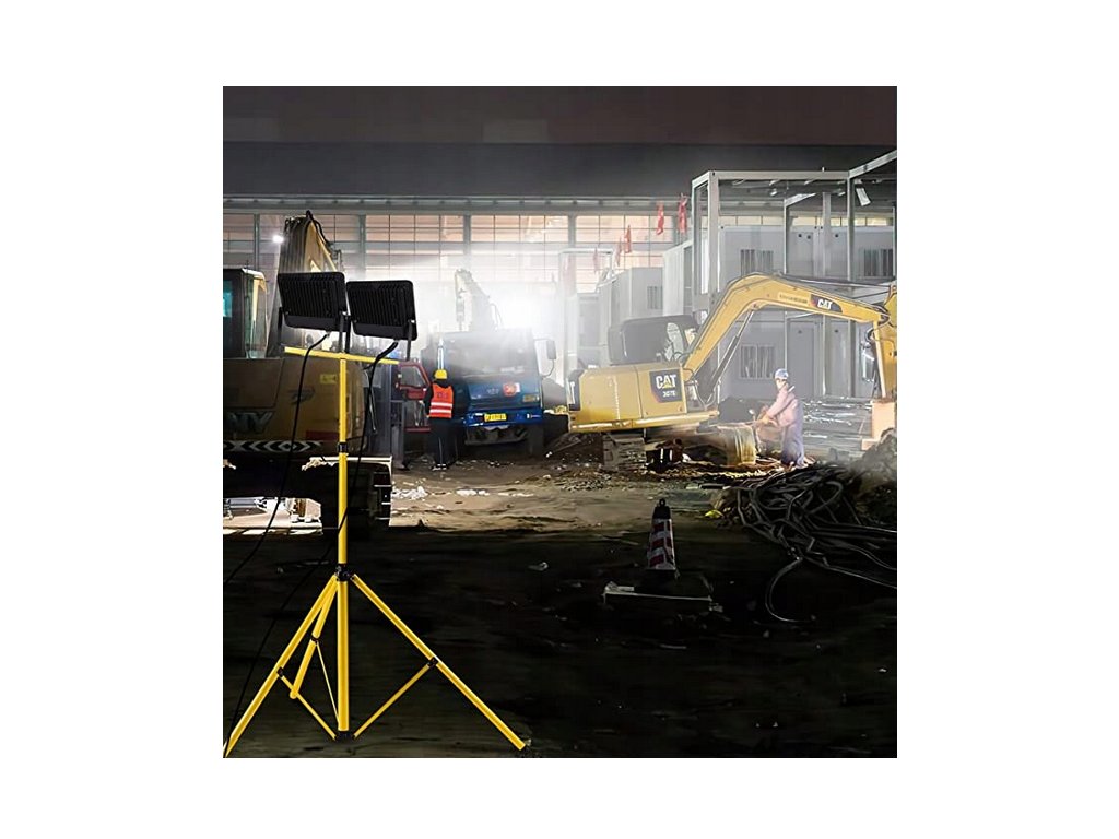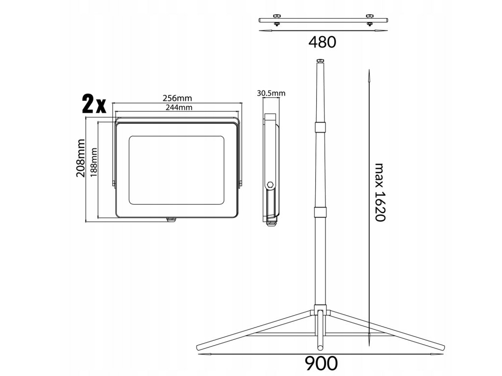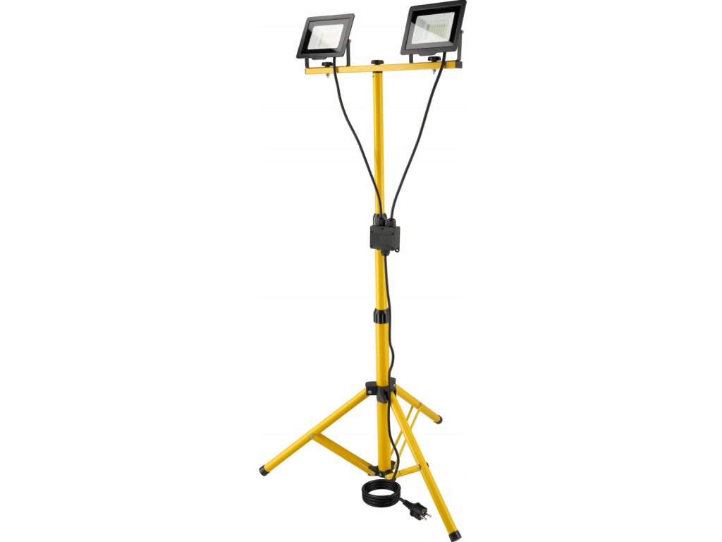 Kompletní sada - dva 2x50W LED reflektory s výkonem 7000 lm každý a studenou barvou 6000K a pevný, skládací konstrukční stativ s nastavením výšky až 162 cm. Sada je vybavena dlouhým 2m kabelem s 230V zástrčkou s uzemněním a hermetickou krabicí, takže je připravena k okamžitému připojení a provozu.