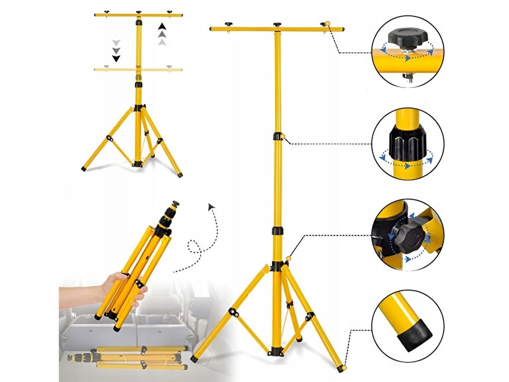 - Stativ je vyroben z oceli, což zajišťuje vysokou odolnost a stabilitu během provozu. Možnost nastavení výšky až do 162 cm umožňuje přizpůsobit osvětlení různým potřebám a podmínkám na staveništi.