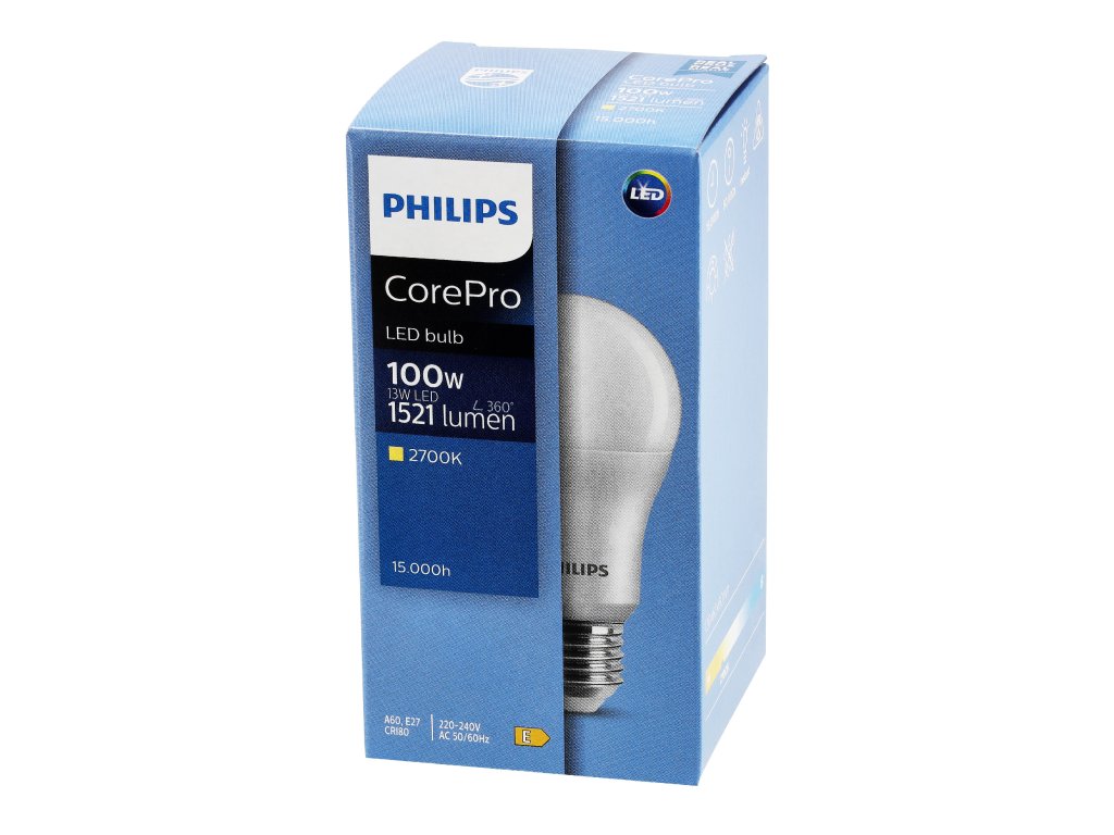 Žárovka Philips CorePro LED 13W E27 2700Kje moderní LED žárovkapůsobivý jas 1521 lumenů, které nahrazuje tradiční 100W světelný zdroj a spotřebovává pouze 13 W. Ideální pro domácí prostory, kde je důležitá energiepohodlí, úspornost a odolnostDíky technologiímEyeComfortChrání váš zrak, nebliká a po zapnutí se ihned rozsvítí.