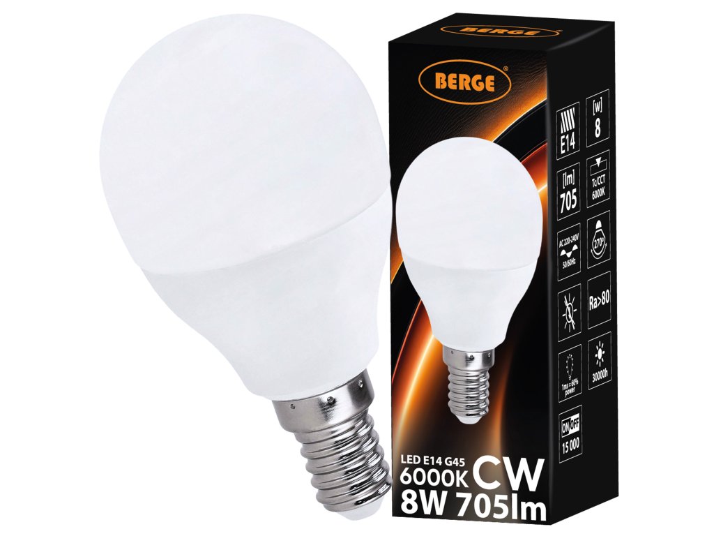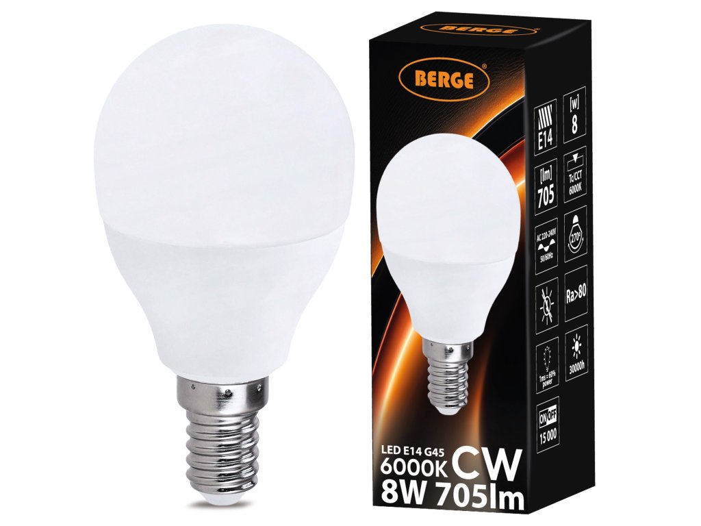 ✨Cenový hit✨ModerníLED žárovka G45 s paticí E148W je energeticky úsporná alternativa ke klasickým žárovkám s výkonem cca 60W. Díkyvysoká světelná účinnost – až 705 lm, poskytuje intenzivní, studené bílé světlo s barevnou teplotou6000 tisíc, ideální pro osvětlení míst vyžadujících přesnost a jasnost světla. ✔️ Hlavní vlastnosti produktu:
