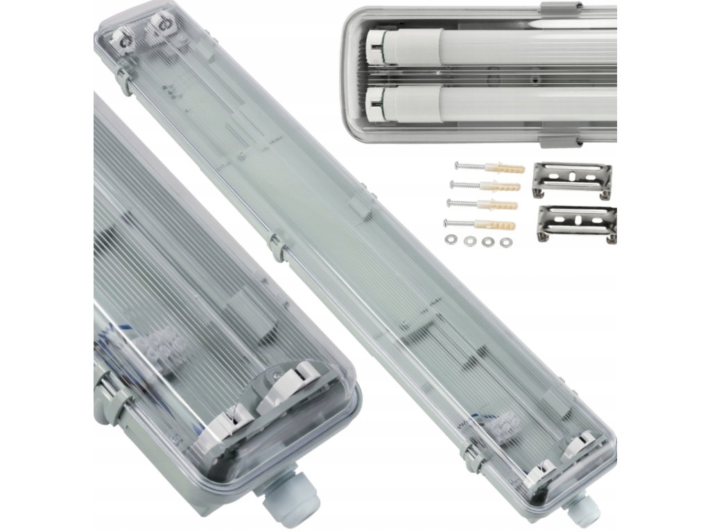 Technické údaje:Velikost:délka 67 cm / výška 7 cm / šířka 10,5 Montáž zářivky:G13 T8 120 cm Počet míst pro zářivku ve svítidle:2 Materiál pouzdra:ABS Materiál stínidla:PS Třída těsnosti:IP65 Napětí: 220–240 V Montážní sada:kolíky, šrouby, průchodka, 2x destička, spony Velikost kabelu:5–10 mm | |