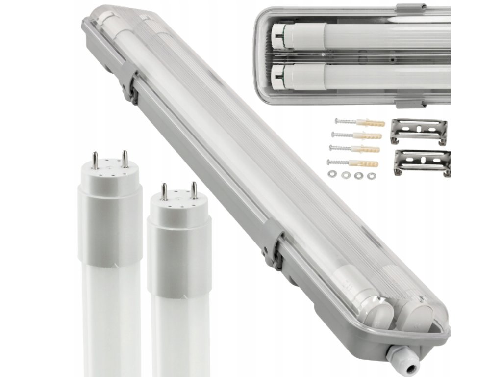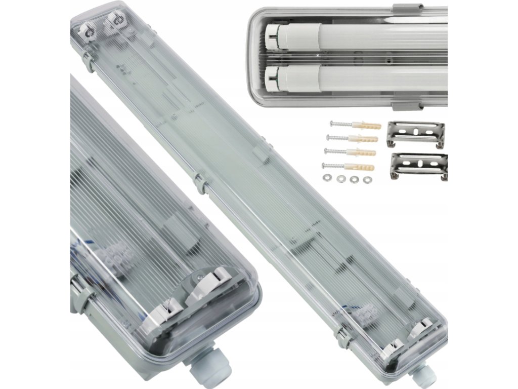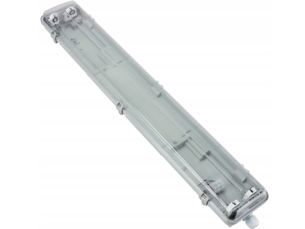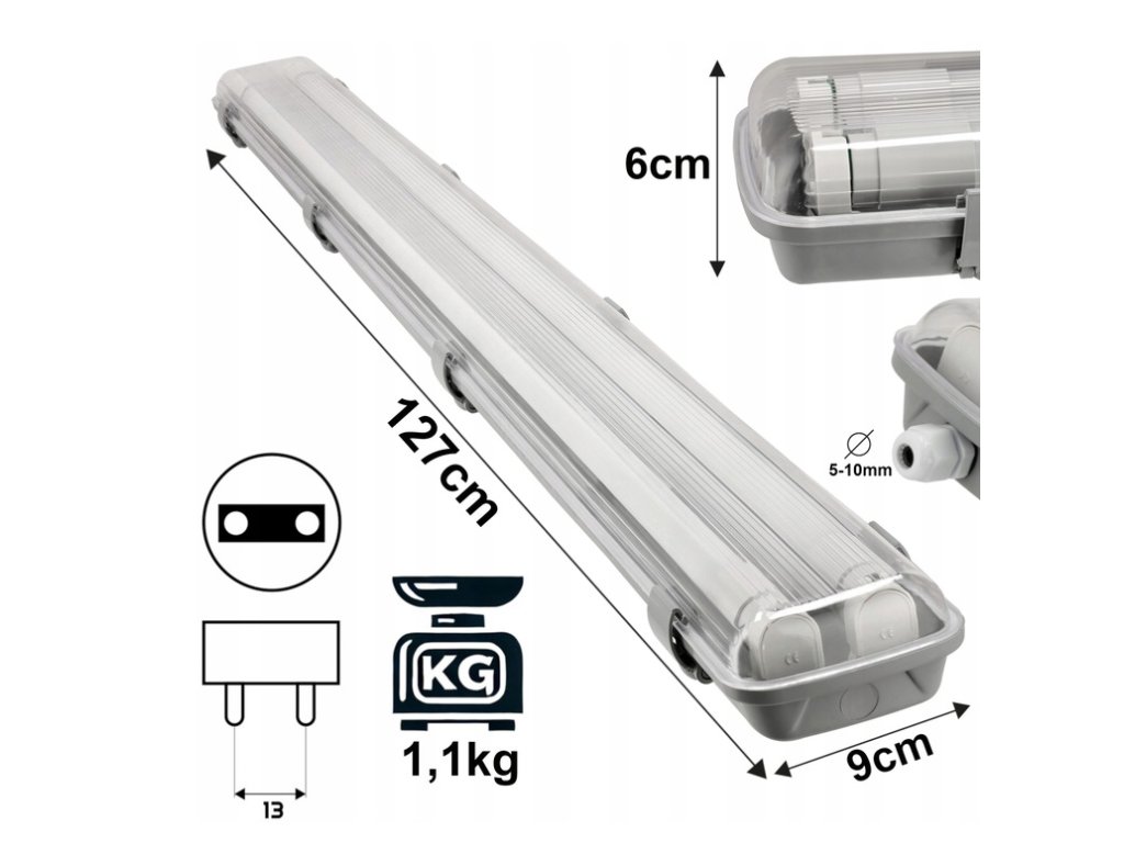 Dane techniczne:Rozmiar: długość 127 cm / wysokość 6 cm / szerokość 9 cm Mocowanie świetlówki: G13 T8 120cm Ilość miejsc na świetlówkę w oprawie: 2 Materiał obudowy: ABS Materiał klosza: PS Klasa szczelności: IP65 Napięcie: 220-240V Zestaw montażowy: kołki, wkręty, dławik, 2x blaszka, klipsy Rozmiar kabla: 5-10mm | |