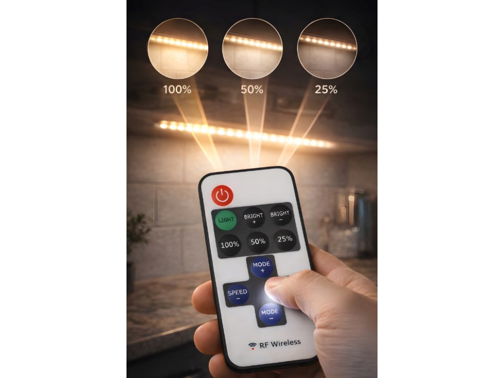⭐ Funkce stmívání – plná kontrola nad světlemSada vám umožňuje plynulé nastavení jasu COB LED páskuPomocí rádiového ovladače a dálkového ovládání si uživatel může snadno nastavit intenzitu světla podle svých aktuálních potřeb – od jemného dekorativního osvětlení až po plný pracovní jas. Kontrola se provádíbezdrátově, aniž byste museli mířit dálkovým ovladačem na přijímač. Nastavení jasu jehladký a stabilní, bez efektu blikání, což výrazně zvyšuje komfort používání a estetiku osvětlení. Další výhodou jepaměť posledního nastavení– po opětovném zapnutí napájení se pásek rozsvítí s dříve nastaveným jasem. | |