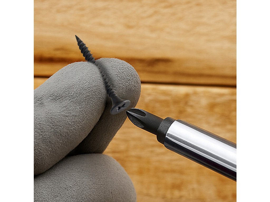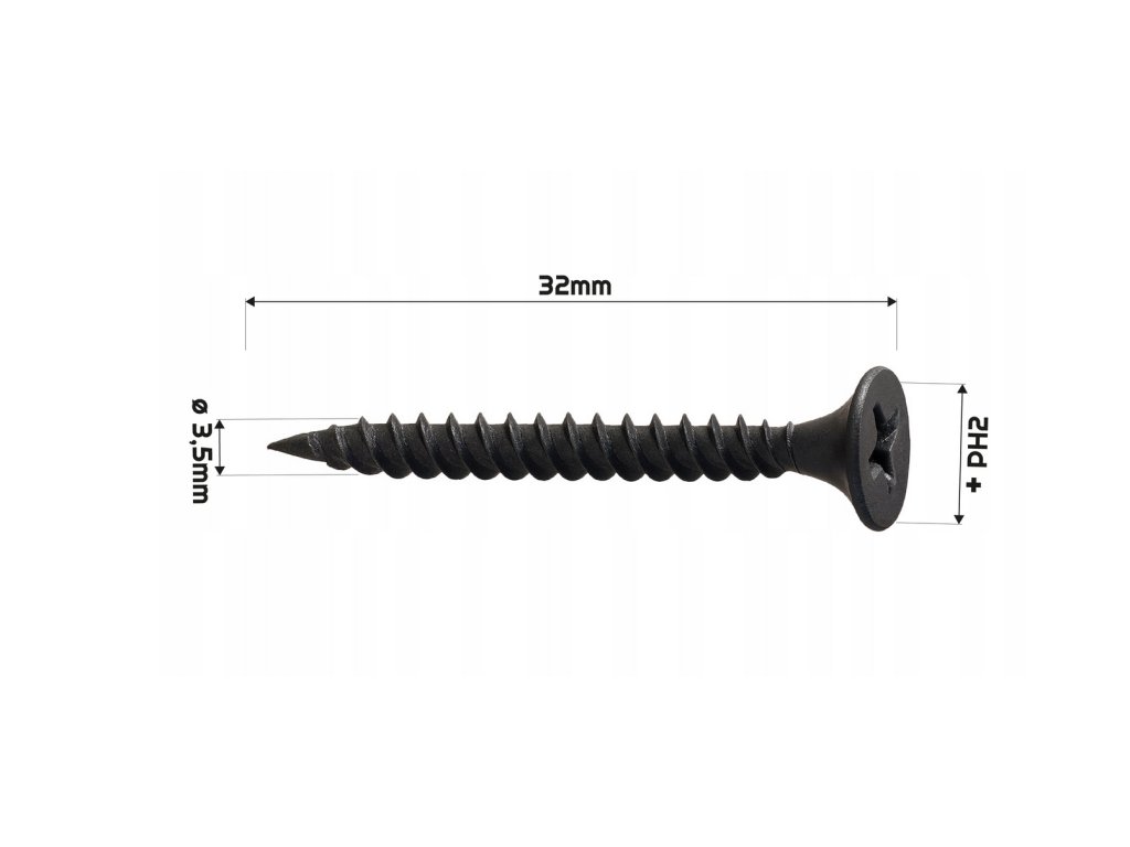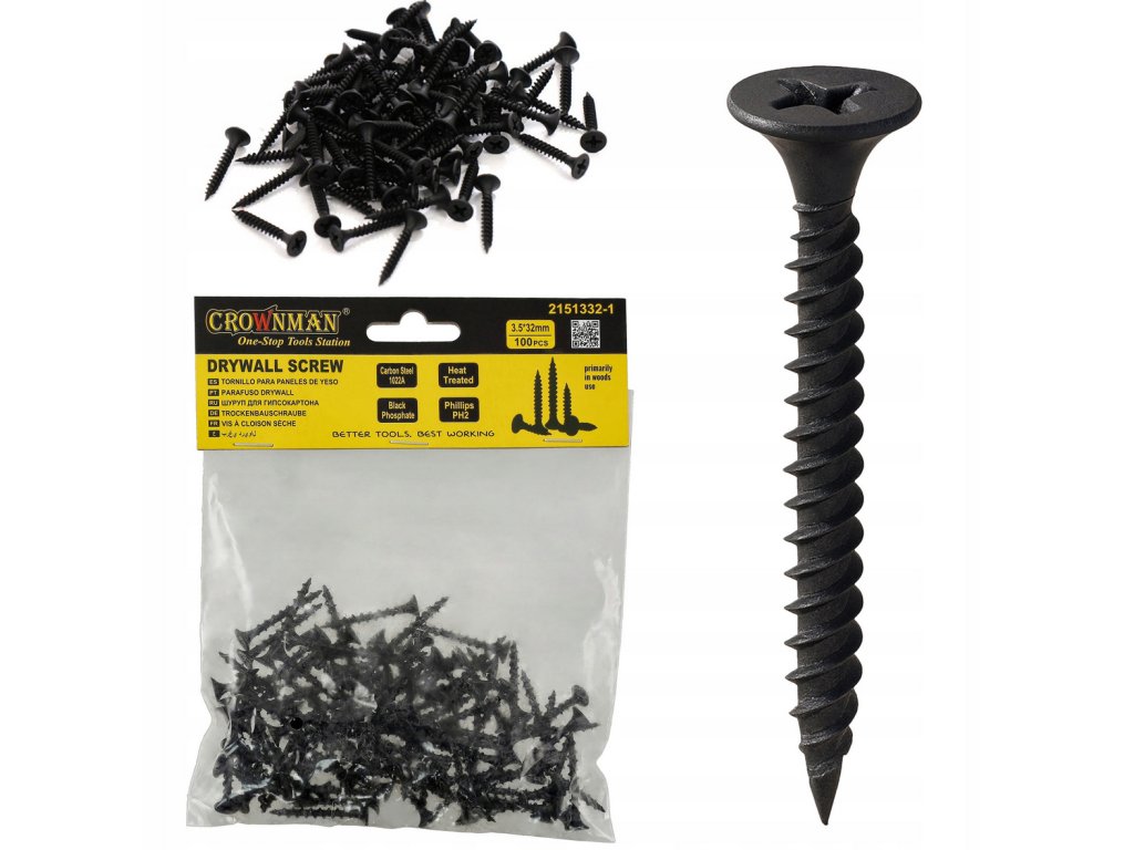 Šrouby do dřeva a sádrokartonu Crownman 3,5×32 mm PH2 – černé, fosfátované, 100 ks. jsou spolehlivé montážní prvky určené speciálně pro sádrokarton (sádrokarton) a dřevěné konstrukce. Kalená ocel a fosfátový povlak zajišťují snadnou instalaci, trvanlivost a odolnost proti korozi.